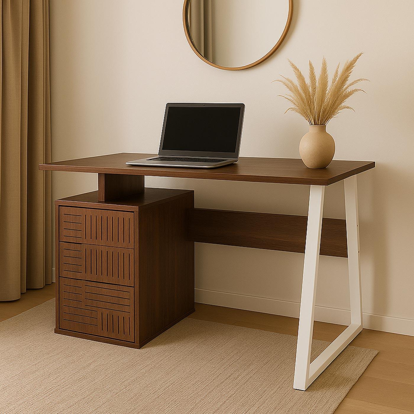 Es handelt sich um einen eleganten und sehr funktionalen Schreibtisch. Er verfügt über eine praktische Kommode mit einzigartigem Stil. Diese ist sehr praktisch, da Sie in den drei Schubladen Dokumente und verschiedene Accessoires aufbewahren können und diese immer griffbereit haben. Wie Sie sehen können, ist die Arbeitsfläche groß und geräumig, sodass Sie Bücher, Accessoires, oder Ihren Computer darauf abstellen können, um Ihre Arbeit zu erleichtern. Die Struktur besteht aus Metall und die kontrastierende Farbe verleiht ihr das gewisse Etwas.