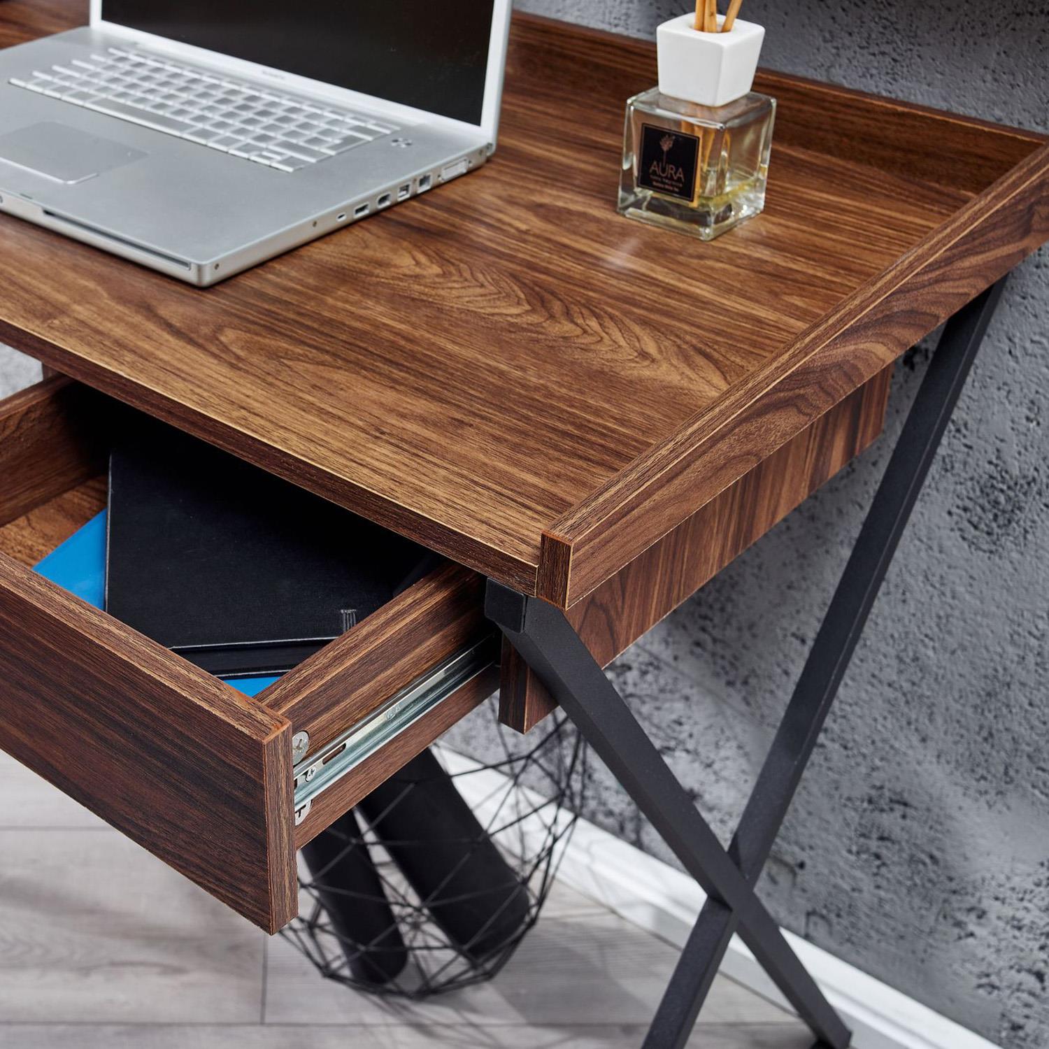 Das schwarze Gestell des Produkts mit Kreuzbeinen ist aus robustem Stahl gefertigt, was die Stabilität gewährleistet. Die Arbeitsfläche und die Schublade sind aus robustem, verstärktem Holzwerkstoff gefertigt, das sehr pflegeleicht und für den täglichen Gebrauch geeignet ist. Außerdem werden Sie die erhöhte Kante an den Seiten und hinteren Teil Ihres Schreibtisches zu schätzen wissen, die verhindert, dass Ihre Dokumente oder Dekorationsgegenstände herunterfallen.