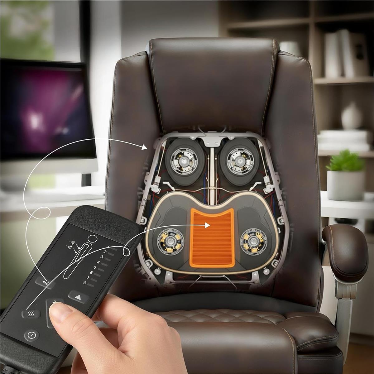 Dieses Modell verfügt über eine integrierte 4-Punkt-Massagefunktion mit vier verschiedenen Modi und einstellbarer Intensität, ideal, um die während des Arbeitstages angesammelte Spannung abzubauen. Darüber hinaus verfügt er über eine beheizbare Sitzfläche, die zu jeder Jahreszeit für ein angenehmes Gefühl von Komfort sorgt. So wird jede Pause zu einem echten Moment der Entspannung.