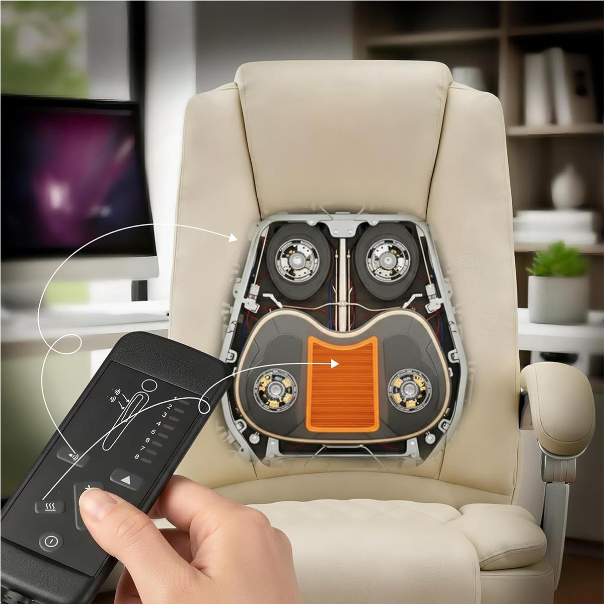 Dieses Modell verfügt über eine integrierte 4-Punkt-Massagefunktion mit vier verschiedenen Modi und einstellbarer Intensität, ideal, um die während des Arbeitstages angesammelte Spannung abzubauen. Darüber hinaus verfügt er über eine beheizbare Sitzfläche, die zu jeder Jahreszeit für ein angenehmes Gefühl von Komfort sorgt. So wird jede Pause zu einem echten Moment der Entspannung.