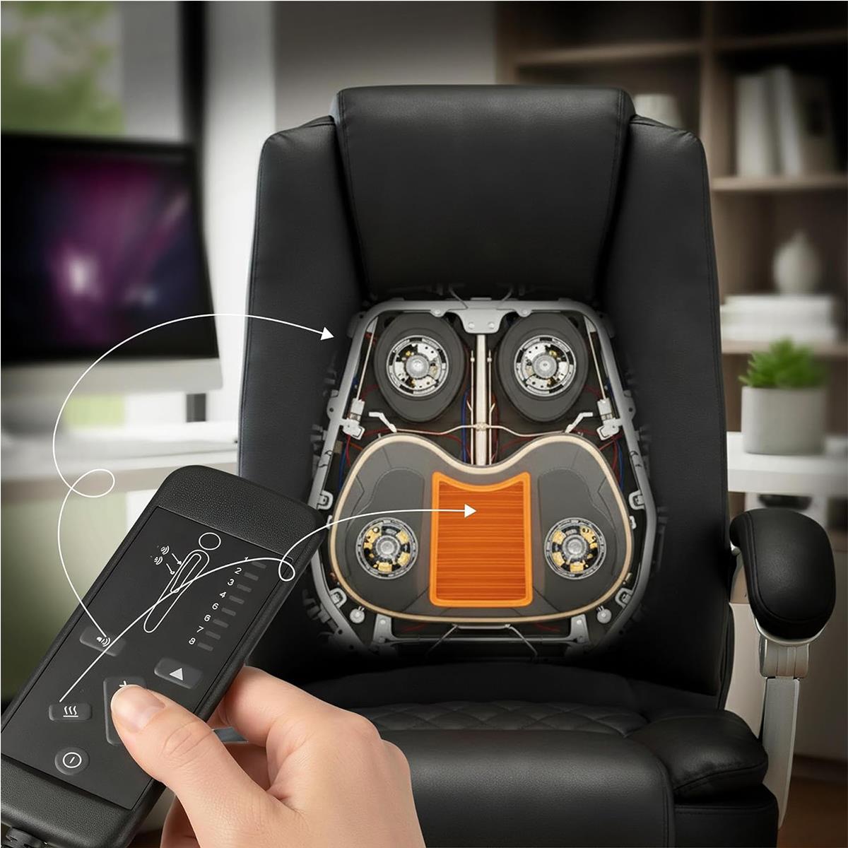 Dieses Modell verfügt über eine integrierte 4-Punkt-Massagefunktion mit vier verschiedenen Modi und einstellbarer Intensität, ideal, um die während des Arbeitstages angesammelte Spannung abzubauen. Darüber hinaus verfügt er über eine beheizbare Sitzfläche, die zu jeder Jahreszeit für ein angenehmes Gefühl von Komfort sorgt. So wird jede Pause zu einem echten Moment der Entspannung.