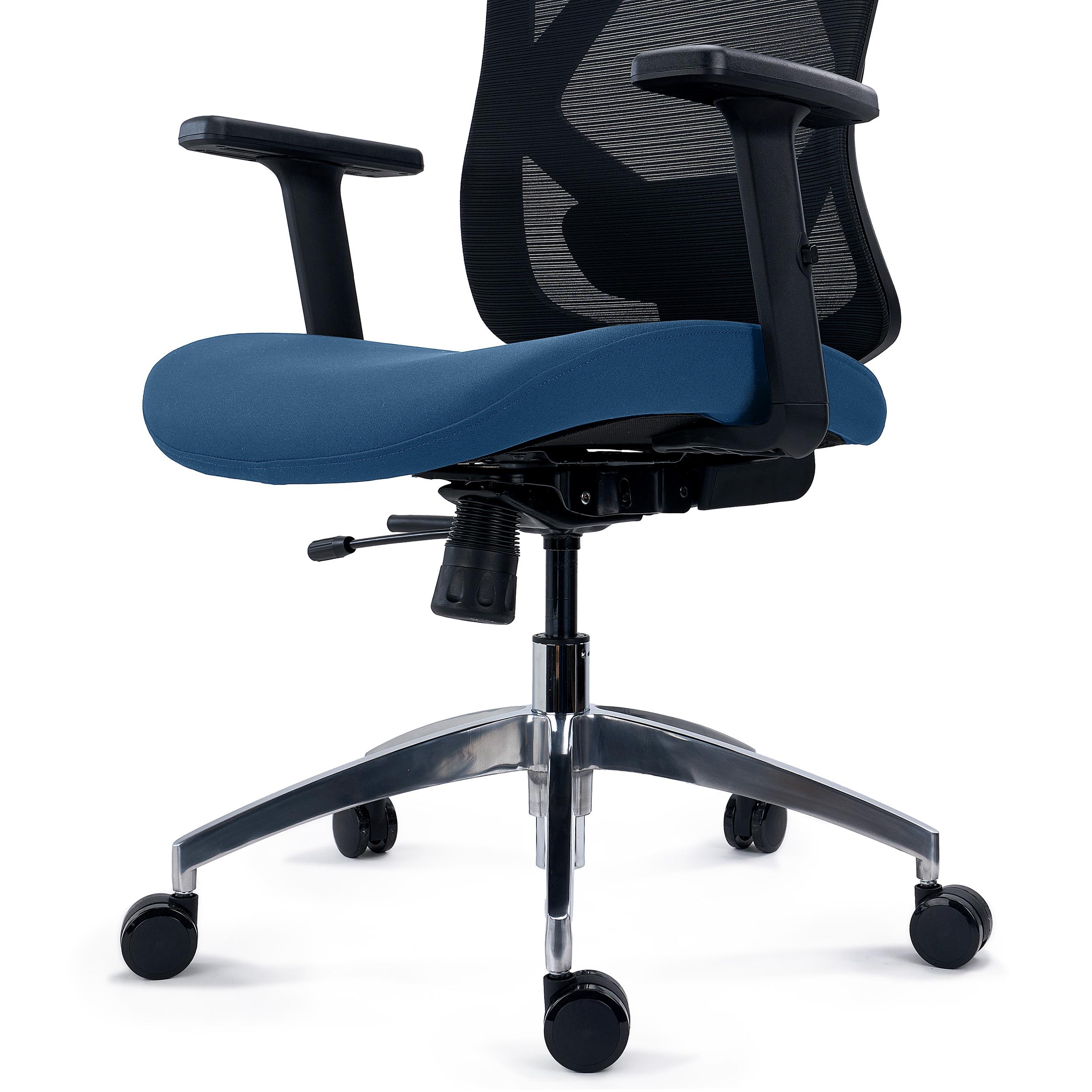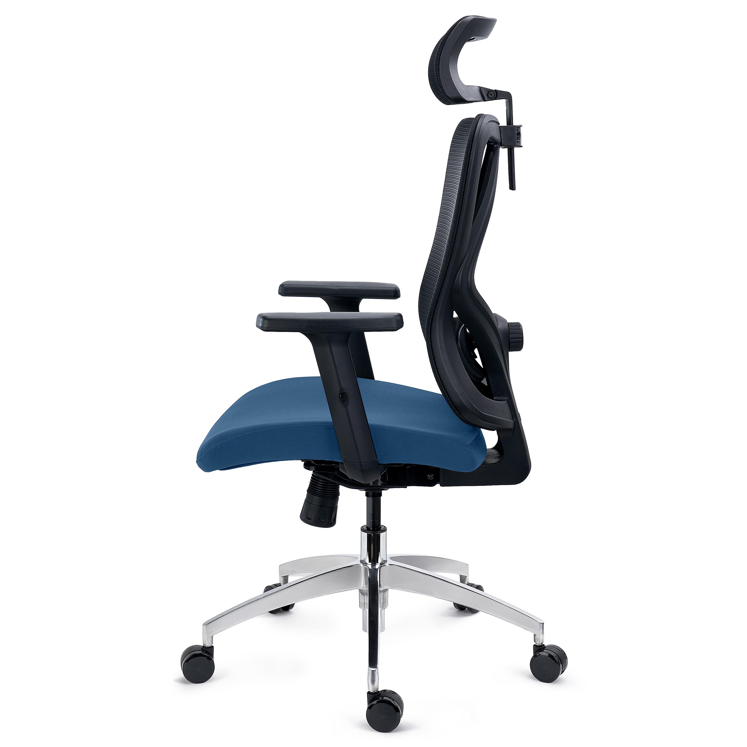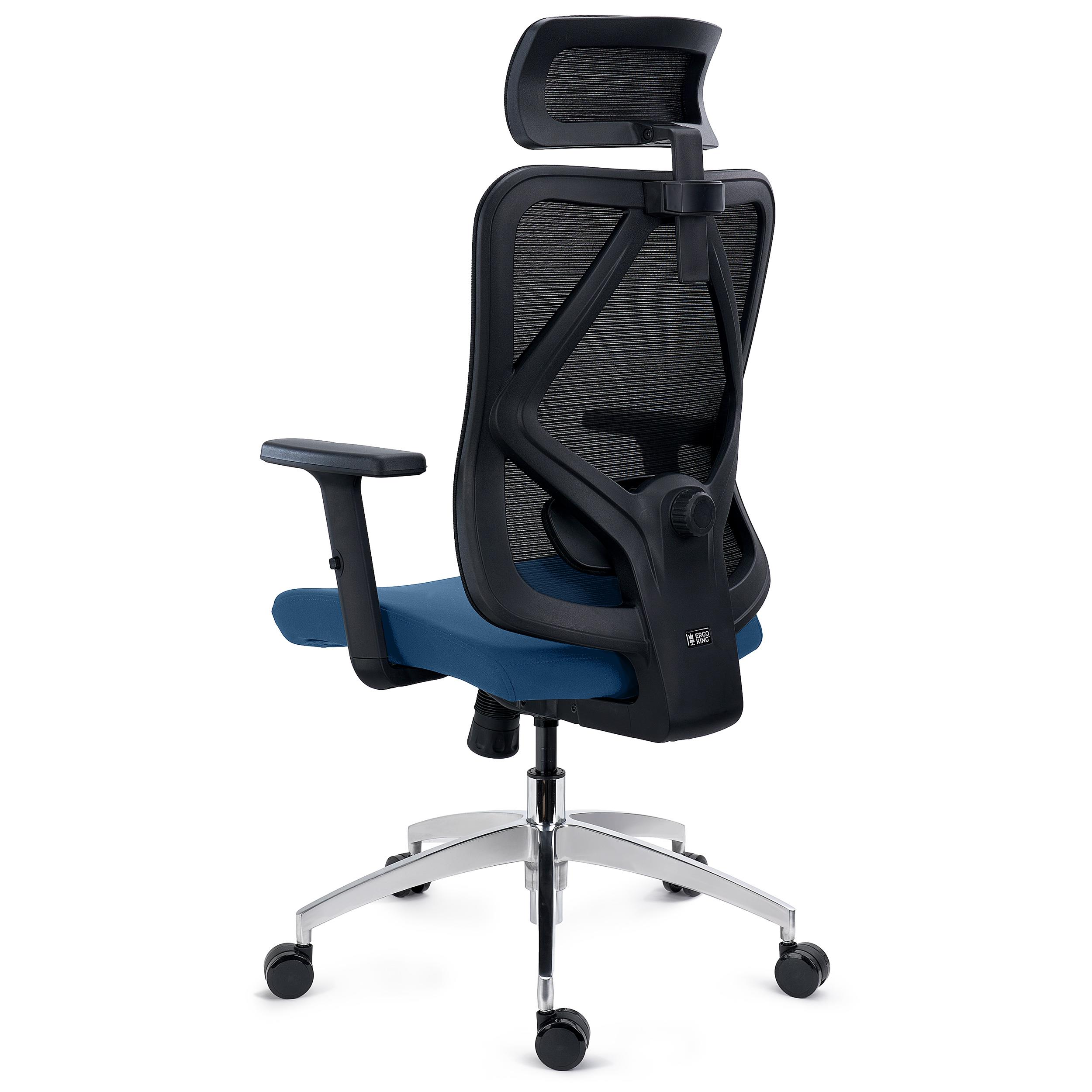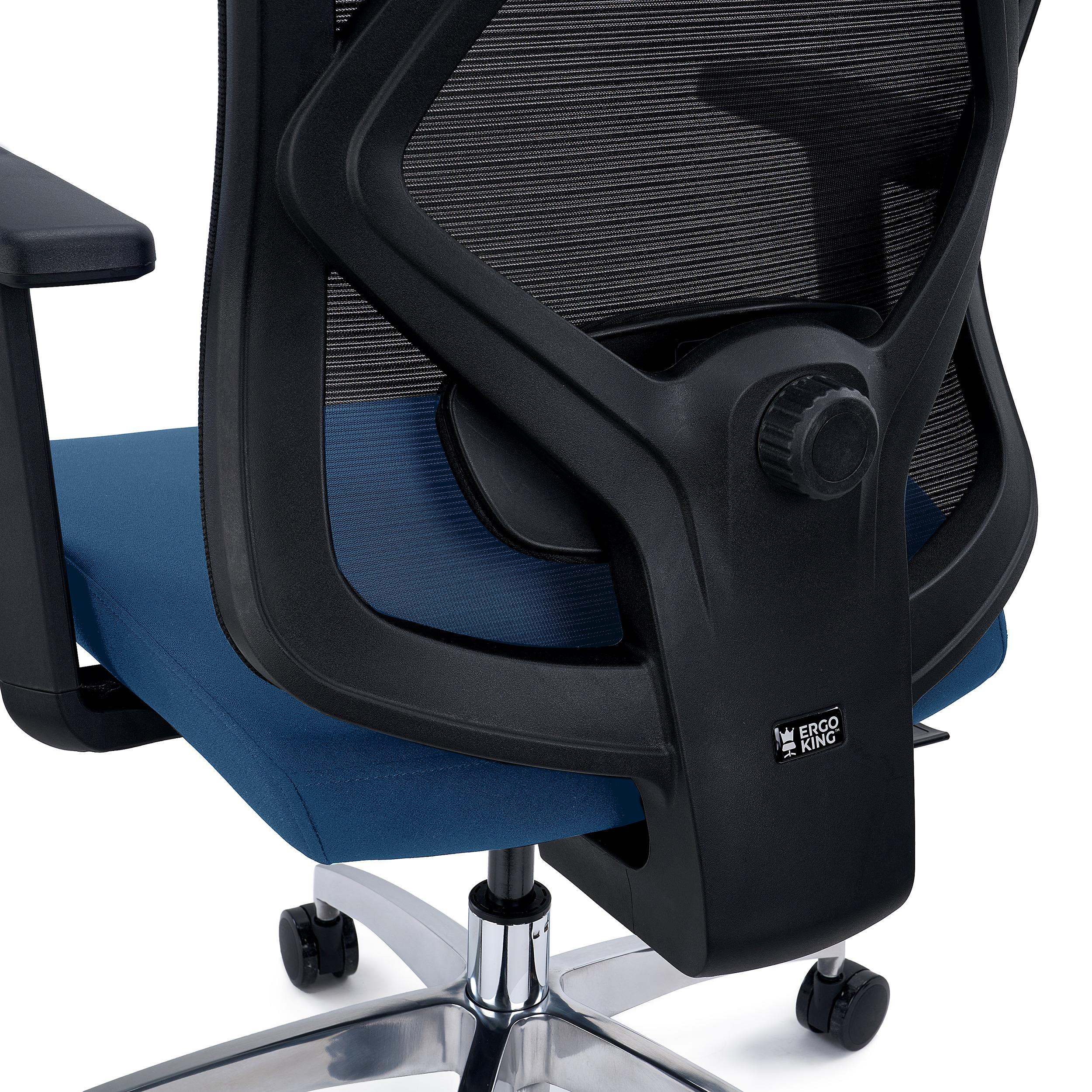 Die Rückenlehne ist ergonomisch geformt und mit 100% atmungsaktivem Netzgewebe mit einem eleganten Muster aus horizontalen Linien bezogen. Die innovative Lendenwirbelstütze ist exklusiv, da sie in der Tiefe, im Winkel und in der Höhe verstellbar ist. Diese Einstellungen ermöglichen eine optimale Unterstützung des unteren Rückens, was sich in einem höheren Komfort niederschlägt, der für lange Arbeitstage unerlässlich ist.