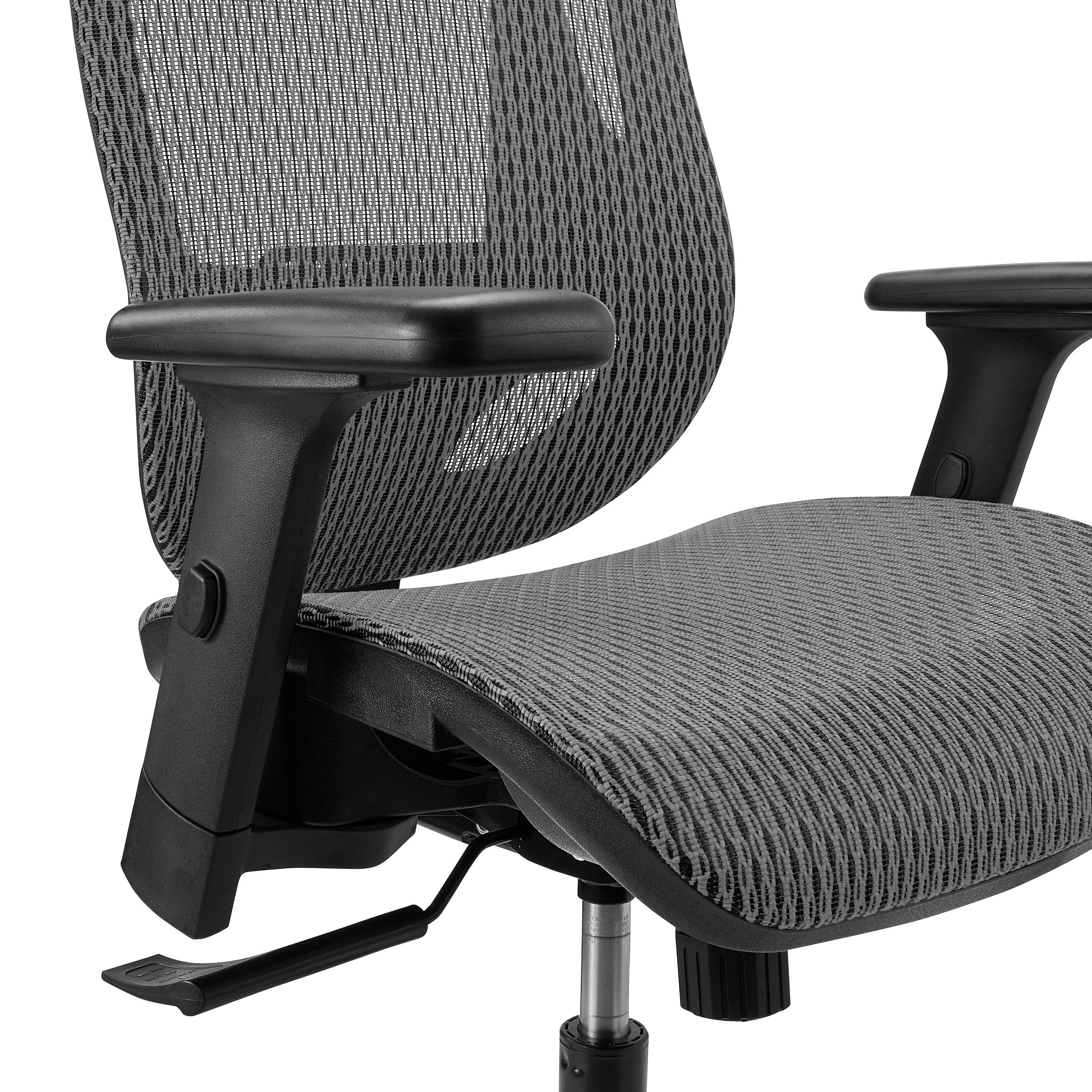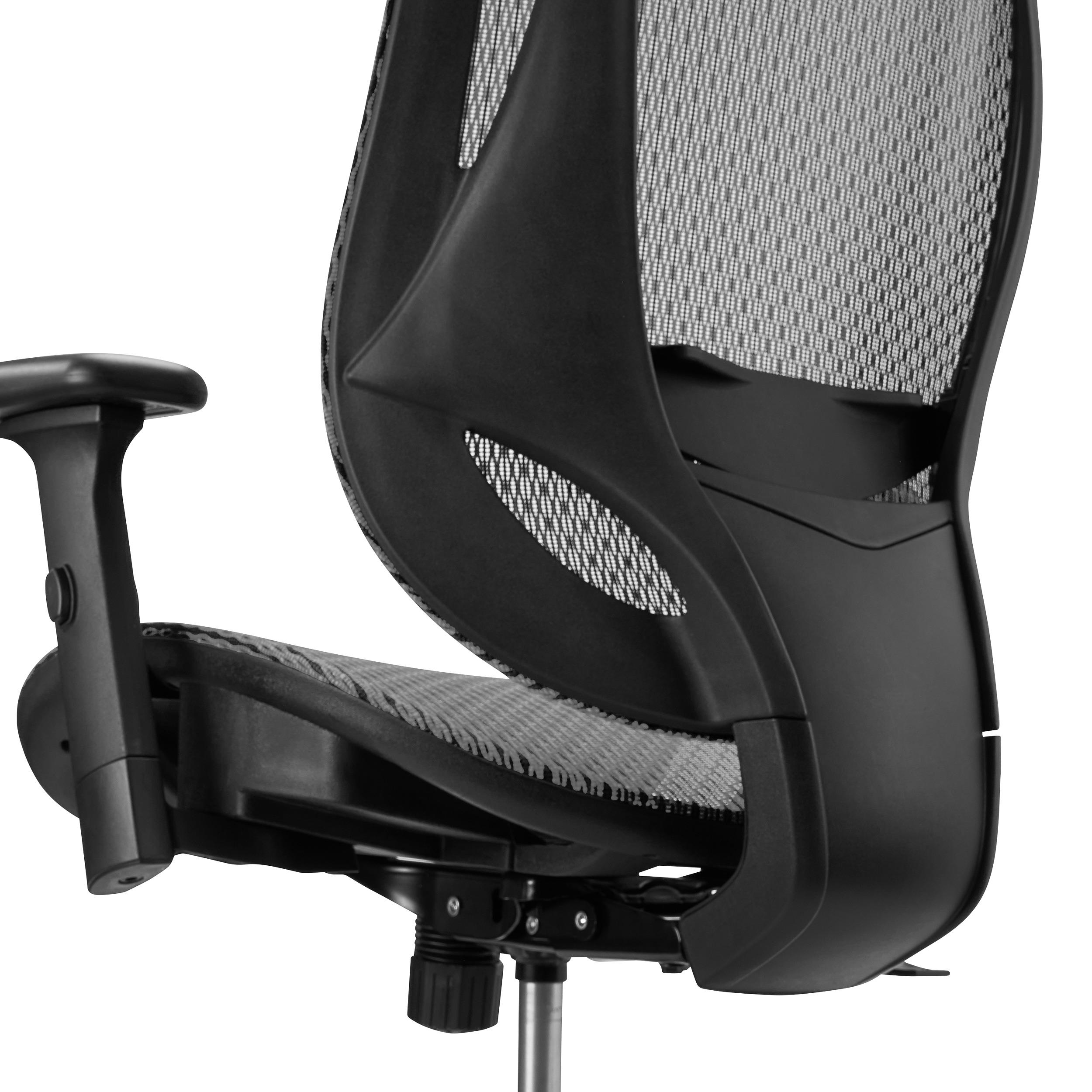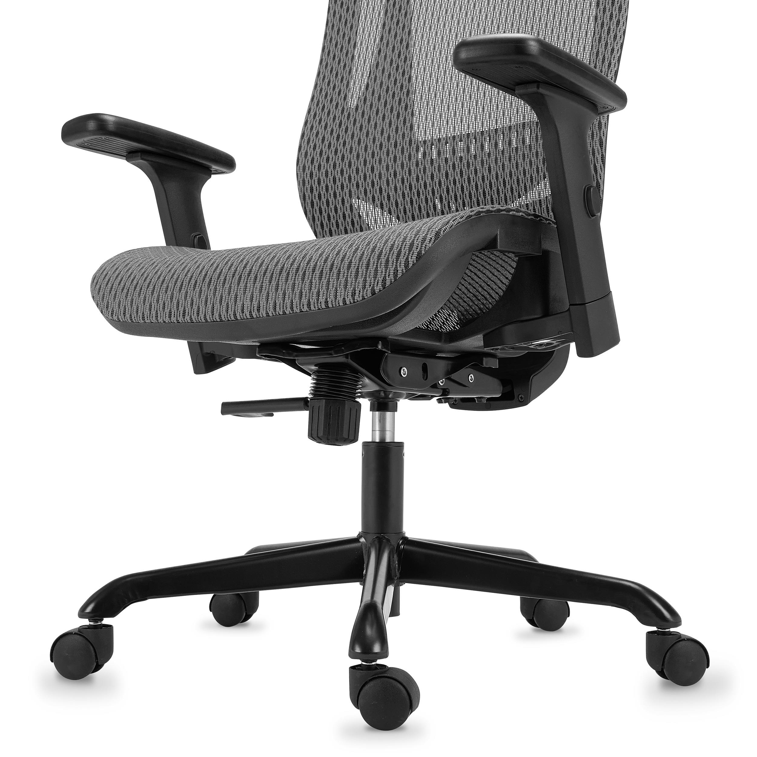 Er verfügt über eine fortschrittliche ergonomische Rückenlehne aus atmungsaktivem Netzstoff mit verstellbarer Lordosenstütze. Diese ist speziell entworfen worden, damit der Rücken in jedem Moment eine optimale Haltung einnimmt. Die Regulierbarkeit der Lordosenstütze ist ein zentraler und wichtiger Aspekt, um die beste Anpassungsfähigkeit zu erreichen.