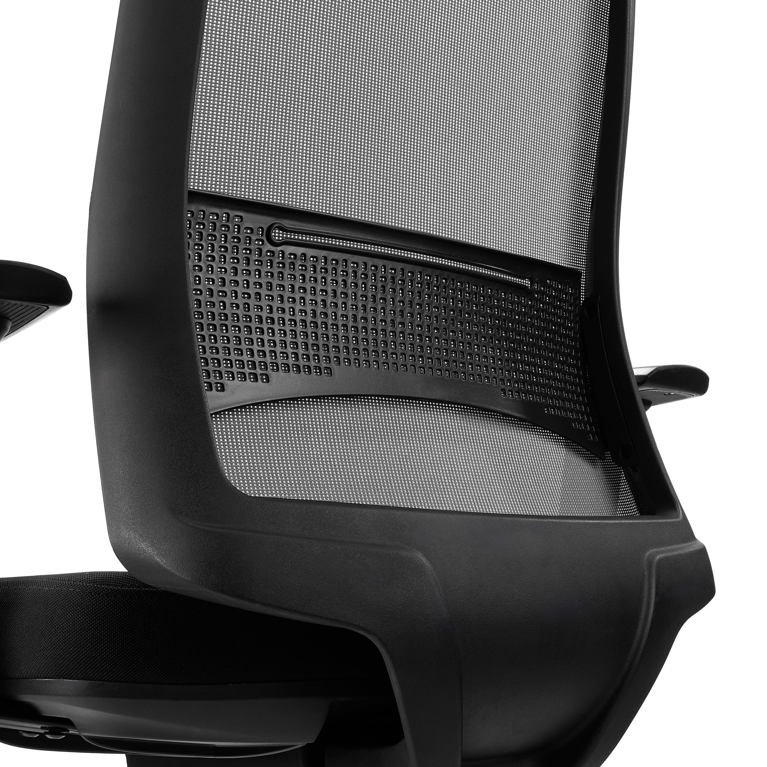 Seine 100% atmungsaktive, ergonomisch geformte Rückenlehne aus Netzstoff mit Lendenwirbelstütze macht diesen Stuhl zu einem besonders bequemen Modell. Diese Lehne wurde speziell entwickelt, um dem Rücken eine optimale Stütze zu bieten, dafür ist die höhenverstellbare Lordosenstütze extra betonenswert.