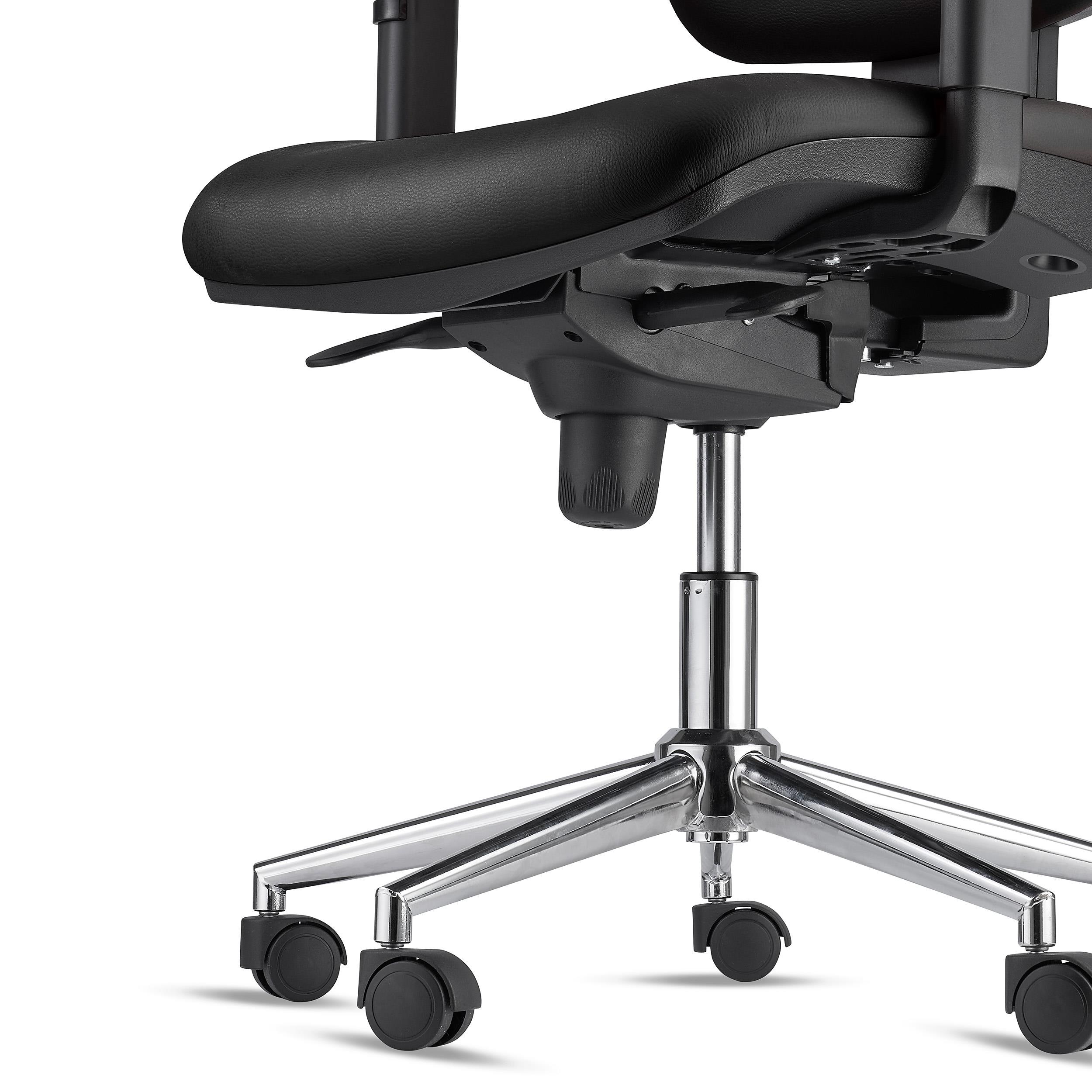 Eine weitere positive Eigenschaft ist die Synchronmechanik der Rückenlehne. Hierbei handelt es sich um eine nützliche und praktische Funktion zum Verstellen der Neigung der Rückenlehne und zum Arretieren in verschiedenen Positionen. Aufgrund der vielen Verstellmöglichkeiten des PIERO LEDER PRO V mit Kopfstütze, eignet er sich für eine intensive tägliche Nutzung von 8 Stunden.