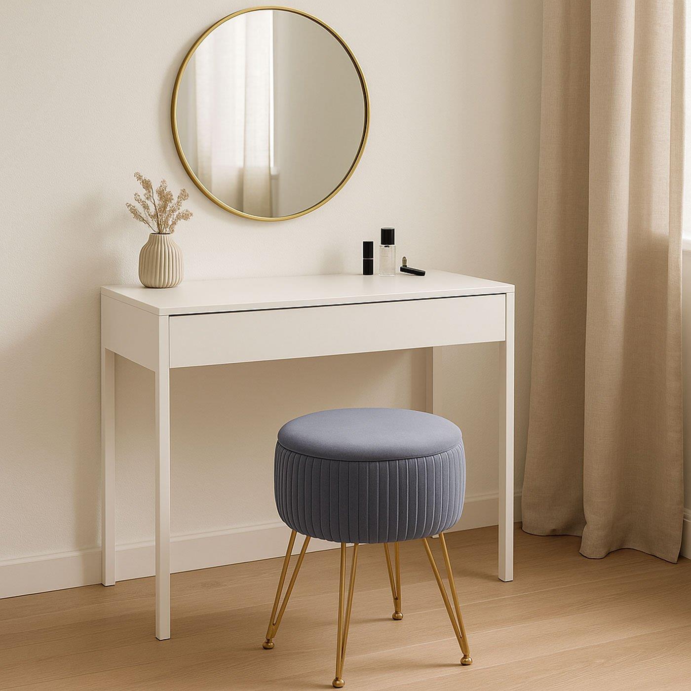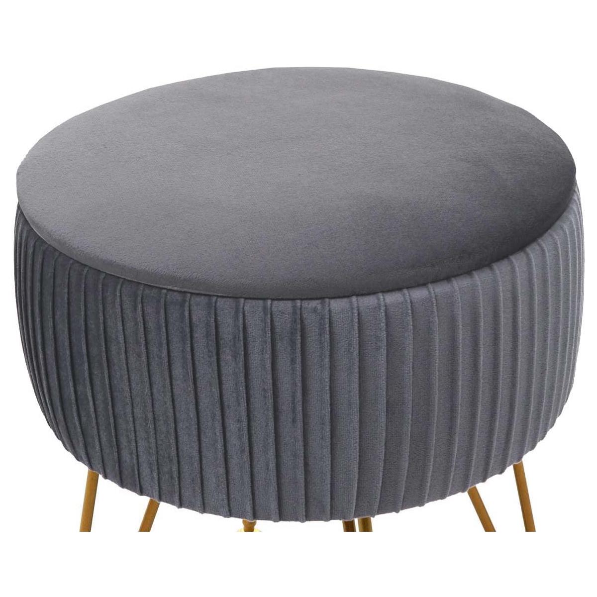 Der Hocker ist mit einem weichen und strapazierfähigen, samtähnlichen Stoff bezogen, der ihm dank der Ziernähte einen raffinierten Look verleiht. Es handelt sich um ein Produkt, das sicherlich nicht unbemerkt bleibt. Das Gestell ist aus massivem Metall gefertigt und garantiert nicht nur einen eleganten Touch, sondern auch eine hervorragende Stabilität. Die Füße sind außerdem verstellbar, sodass dieser Hocker auch auf unebenen Oberflächen aufgestellt werden kann.