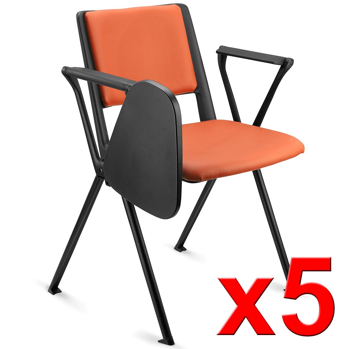 Im 5er-Set: Konferenzstuhl CARINA MIT SCHREIBBRETT, stapel- und reihenverbindbar, schwarzes Stahlgestell, Kunstleder, Farbe Orange