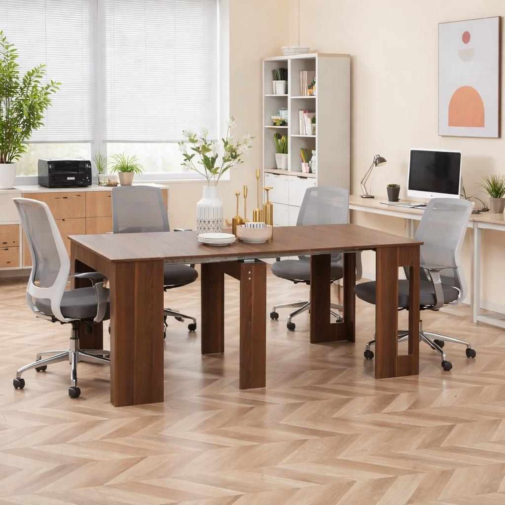 Bei maximaler Auszugslänge bietet der Tisch bequem Platz für bis zu 6 Personen und ist damit der ideale Ort für Brainstorming-Sitzungen, Teambesprechungen oder sogar Firmenessen. Robustheit ist eine weitere Stärke: Die Konstruktion ist auf absolute Stabilität ausgelegt und hält einer Belastung von bis zu 60 kg stand. Die Oberfläche aus Holz mit hochwertiger Laminatbeschichtung verleiht dem Tisch nicht nur eine warme und professionelle Ausstrahlung, sondern ist zudem äußerst widerstandsfähig im täglichen Gebrauch und sehr leicht zu reinigen.
