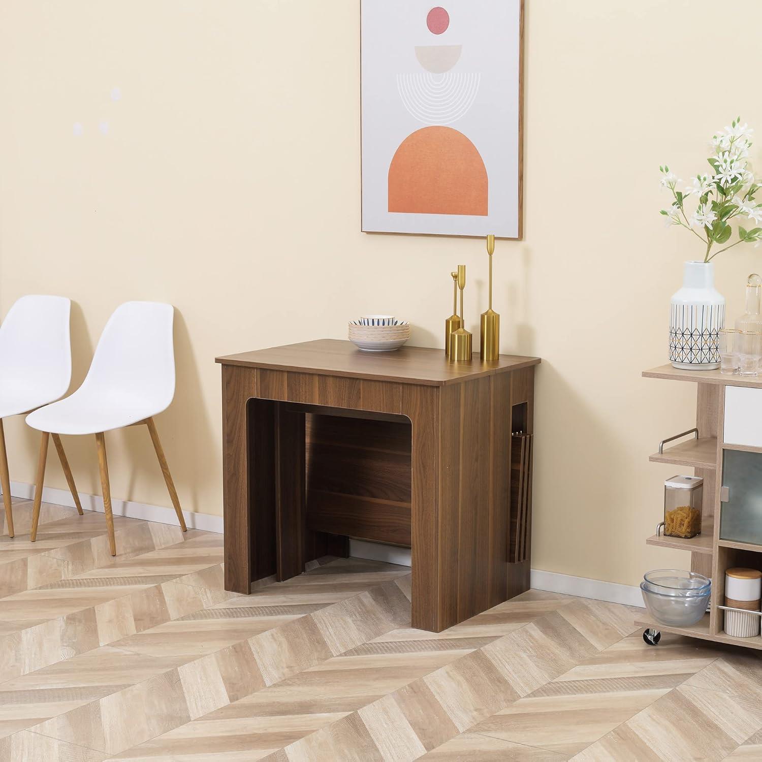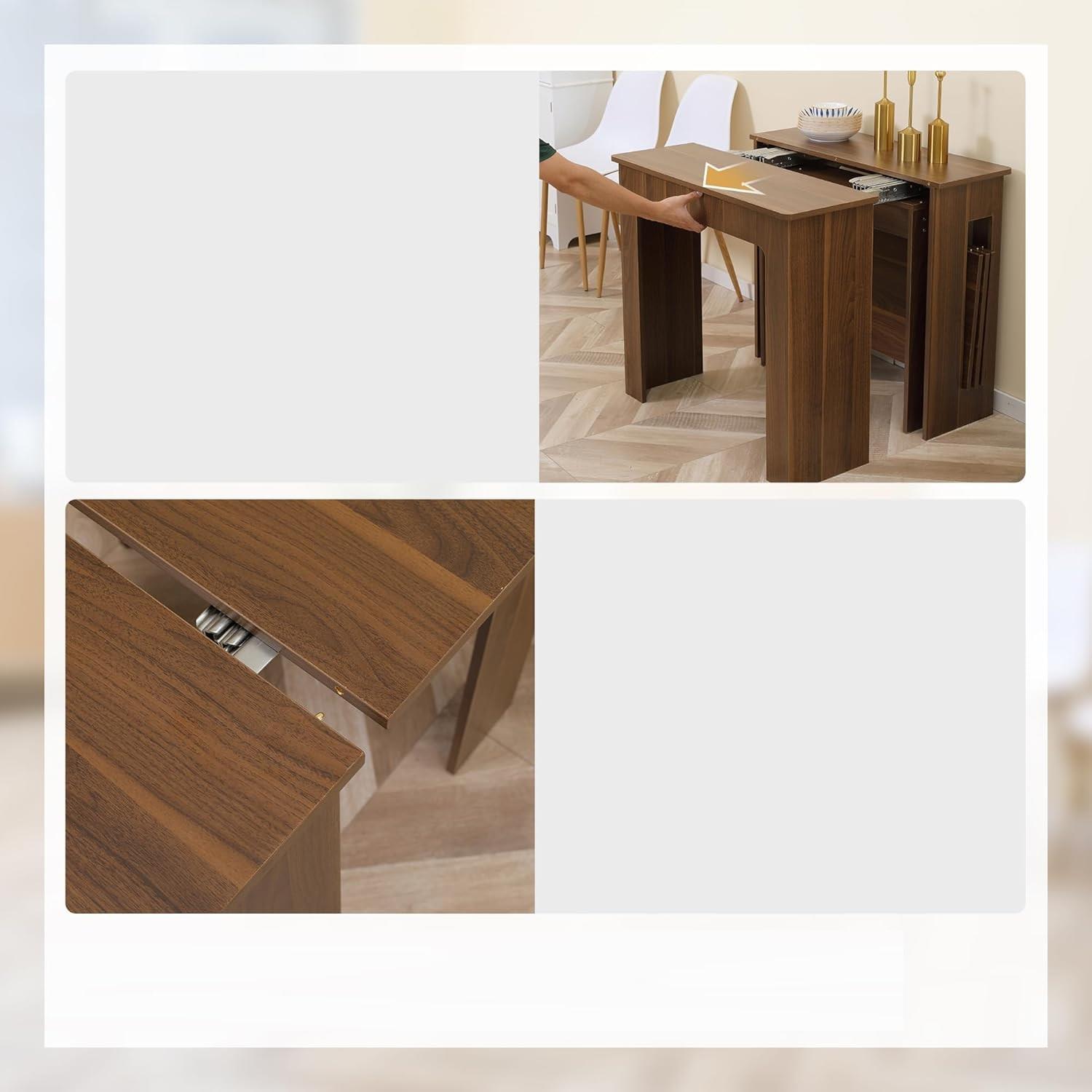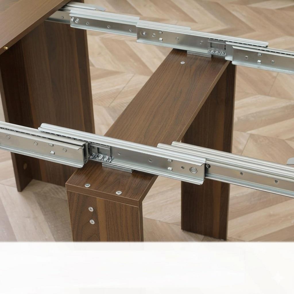 Besonders hervorzuheben ist das ausgeklügelte Auszugssystem mit robusten Stahlschienen. Der leichtgängige Mechanismus ermöglicht es, die Tischfläche schnell und ohne großen Kraftaufwand von einer Person zu erweitern – von einer kompakten 60-cm-Konsole zu einem großzügigen Tisch von bis zu 180 cm. Die Zusatzplatten lassen sich mühelos einsetzen und ebenso einfach wieder unter dem Tisch verstauen, sodass jederzeit Ordnung und ein aufgeräumtes Erscheinungsbild gewährleistet sind.