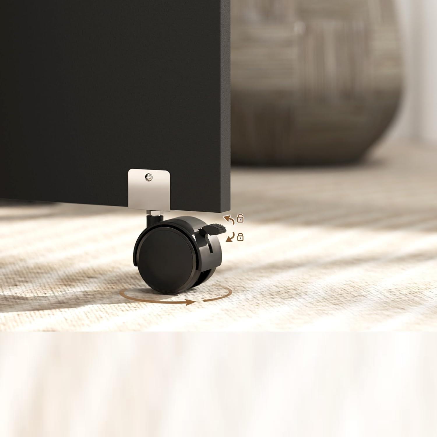 Neben seiner flexiblen Bauweise überzeugt der Tisch auch durch praktische Details. Zwei zentrale Ablagefächer bieten zusätzlichen Stauraum für Unterlagen oder Zubehör. Für mehr Komfort und Stabilität ist das Modell außerdem mit zwei Rollen inklusive Feststellbremse ausgestattet, sodass es sich leicht bewegen und sicher fixieren lässt. Die Konstruktion aus hochwertigem Holz sorgt für Stabilität und Langlebigkeit, während das Design insgesamt leicht und zeitgemäß wirkt.