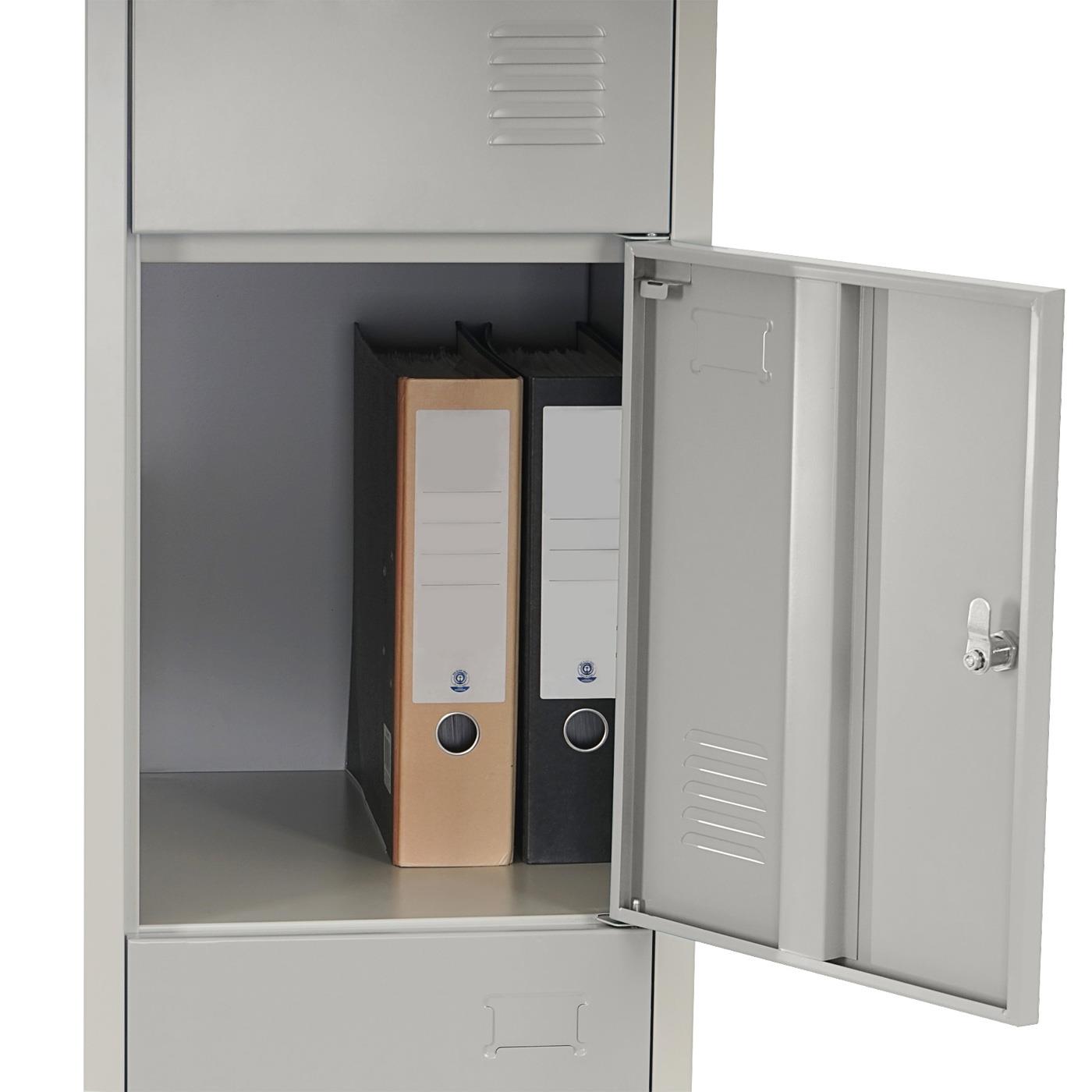 Seine Abmessungen von 180 x 38 x 45 cm machen ihn zu einem kompakten und vielseitigen Stauraum, der überall hinpasst, so dass der vorhandene Platz aufs äußerste genutzt werden kann. Der Spind verfügt über 4 einzeln abschließbare Türen, mit einem zusätzlichen Schlüsselsatz pro Tür.